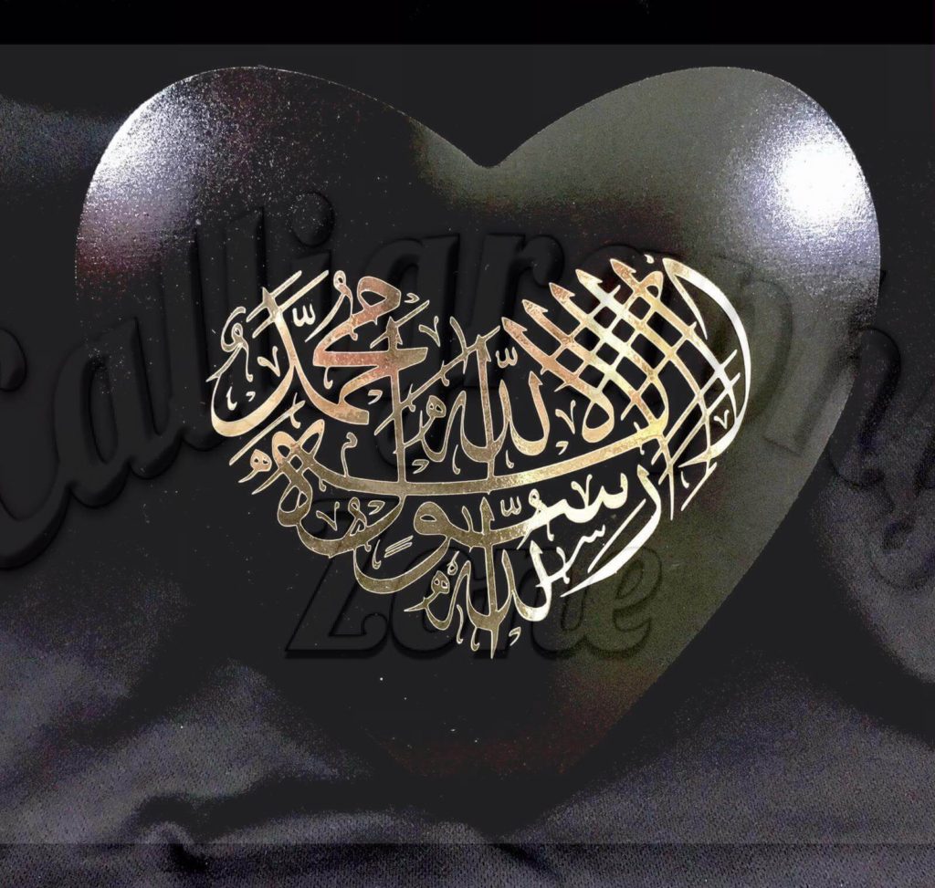 A beautifully handcrafted wooden heart with the First Kalma in golden color.